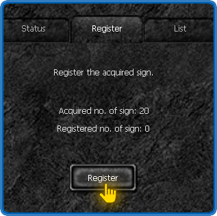 • Acquire no. of sign: Number of Sing of Lord in your inventory available for registration.