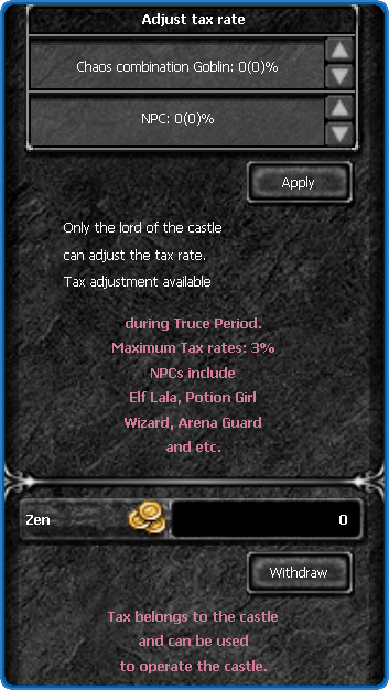 • The taxes collected will be displayed as a remaining Zen of the senior NPC. Only the king of the castle is allowed to collect taxes.