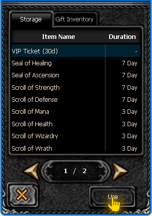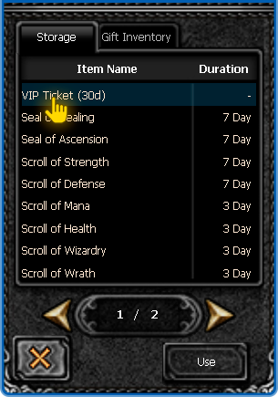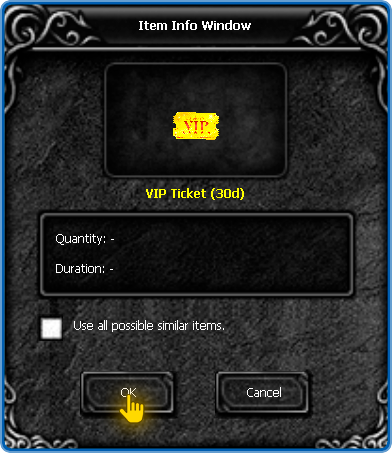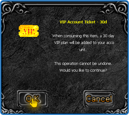 If you choose to choose to use the benefits of the VIP ticket, right-click on it in the inventory. A confirmation box will appear, by confirming by clicking OK you will receive all VIP benefits. See the example below indicating where you should click: