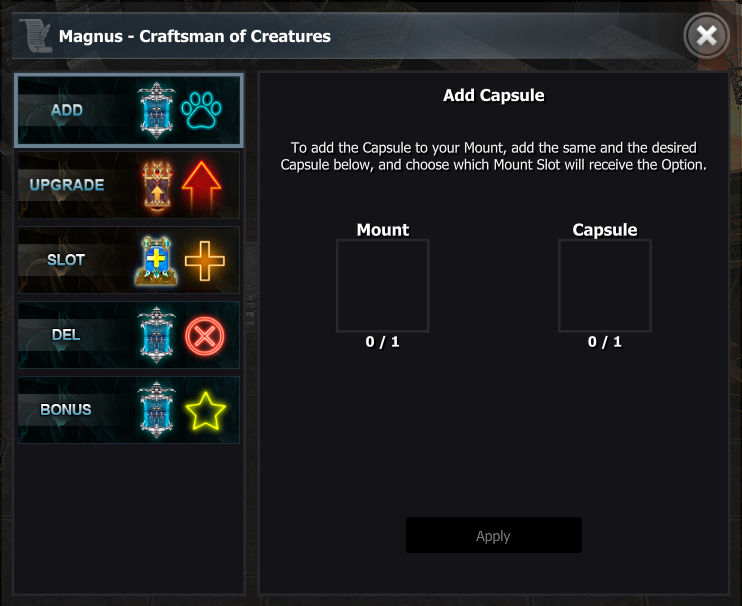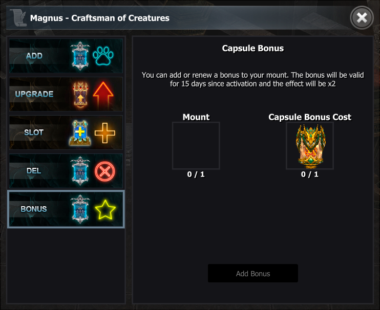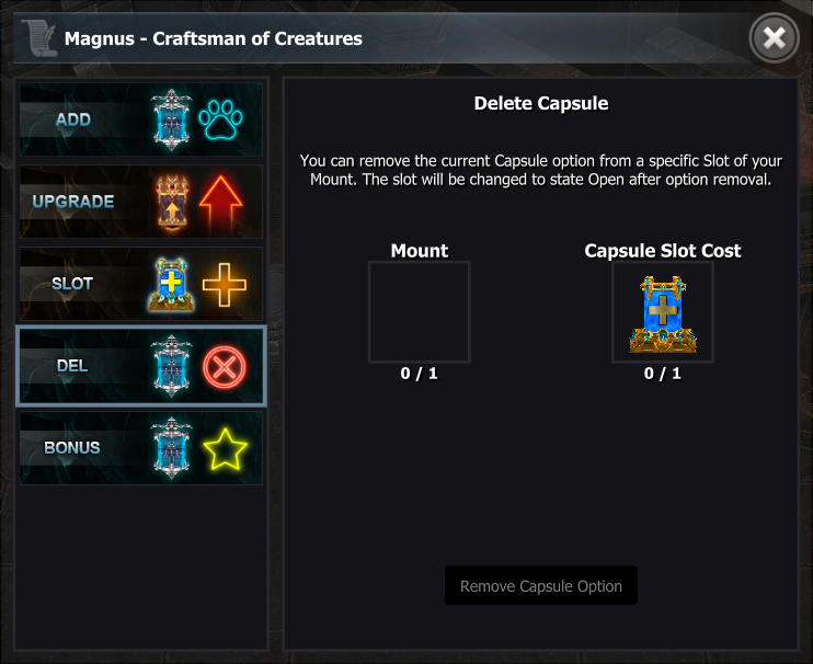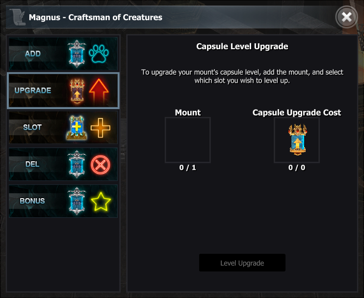 Evolving your mount you will be able to multiply in certain percentage (%) per level the options of the Monster Capsule (more details below) applied to the mount.