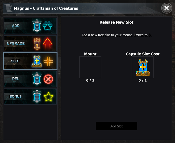 You will receive one of the mounts that support the Capsule System at level +0 with the possibility to come with 1, 2, 3 or 4 slots open to place the new option of the Monster Capsule (more details below).