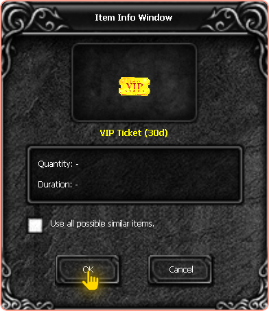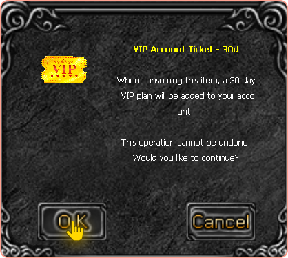 If you choose to choose to use the benefits of the VIP ticket, right-click on it in the inventory. A confirmation box will appear, by confirming by clicking OK you will receive all VIP benefits. See the example below indicating where you should click: