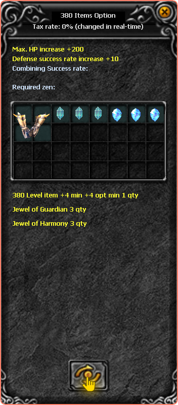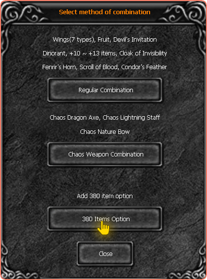 380 items are rare, unique, and massively powerful equipment. Available in SEASON 2, 380 items can be obtained through events or by defeating Bosses on the continent, they have unique characteristics (MU standard) and do not have an excellent additional, they can have the Jewel of Life, Harmony and a powerful additional of reinforcement (extra purple) that can be obtained through combination in the Chaos Machine.